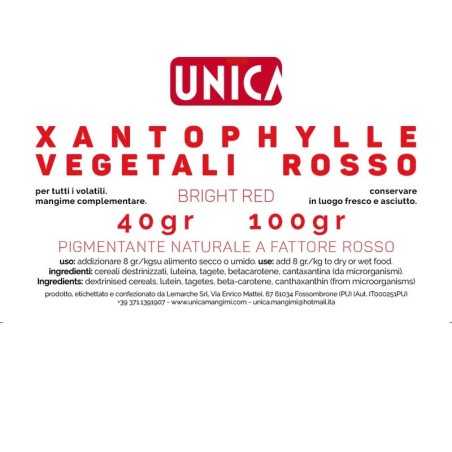 La gamma di coloranti Unica mangimi destinati agli uccelli domestici, sia granivori che insettivori, sono realizzati con pigmenti sia giallo che rosso, composti da xantofille e carotenoidi naturali, una miscela di petali di fiori polverizzati a freddo specifica per la difficile e delicata pigmentazione dei lipocromi dei cardellini.